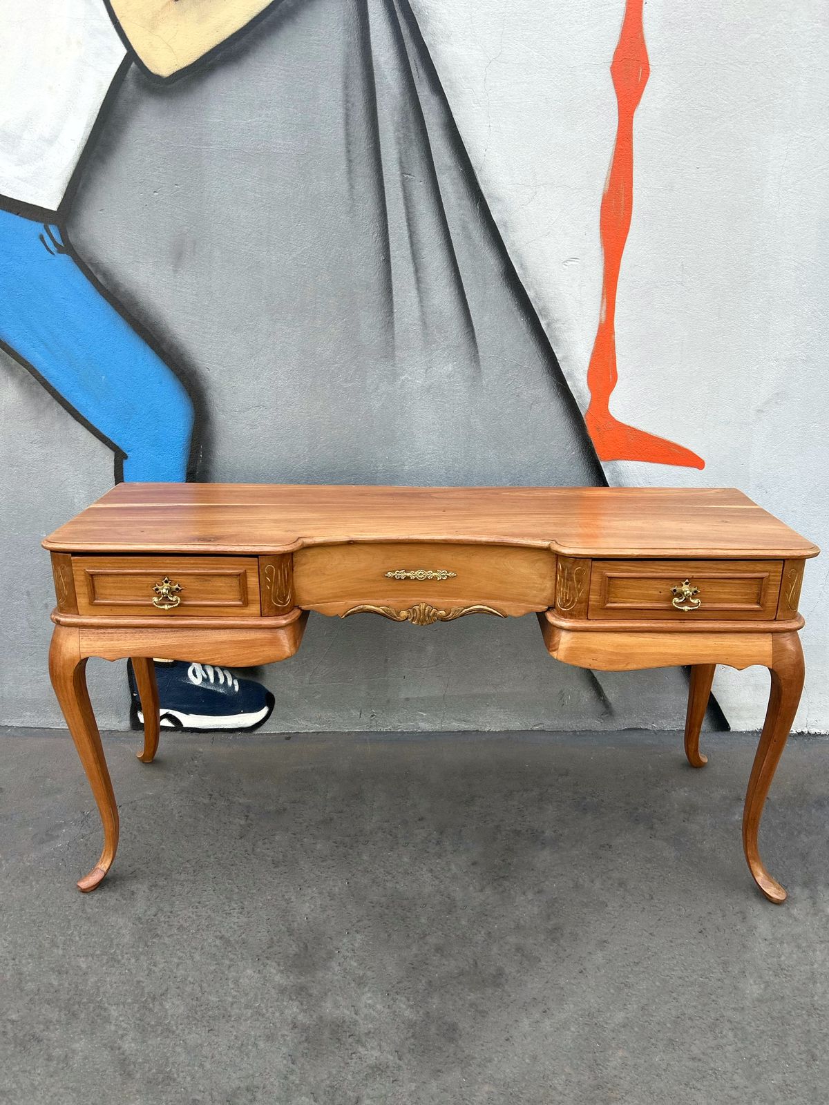 Esta peça é uma elegante escrivaninha ou aparador no estilo clássico, confeccionada em madeira maciça com acabamento natural que destaca a beleza dos veios. Seus detalhes entalhados e pés curvilíneos no estilo cabriole adicionam um charme refinado e atemporal. A peça possui três gavetas com puxadores de metal ornamentados, ideais para armazenamento prático e organizado. Perfeita para compor ambientes sofisticados, como escritórios, salas de estar ou até mesmo quartos, unindo funcionalidade e estilo.